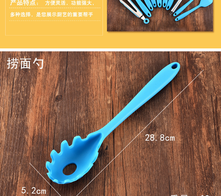 套装:捞面勺、汤勺、锅铲、漏铲、油刷、漏勺、食物夹、打蛋器、奶油刮刀、小刮刀