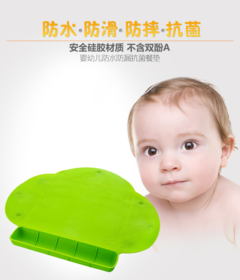 3、防水抗菌餐垫,卡通图案让宝宝享受快乐的用餐环境,不用担心餐桌或者其他地方的细菌会感染给宝宝,妈