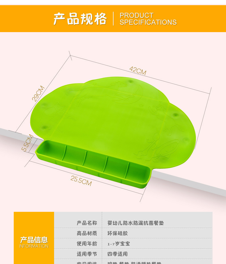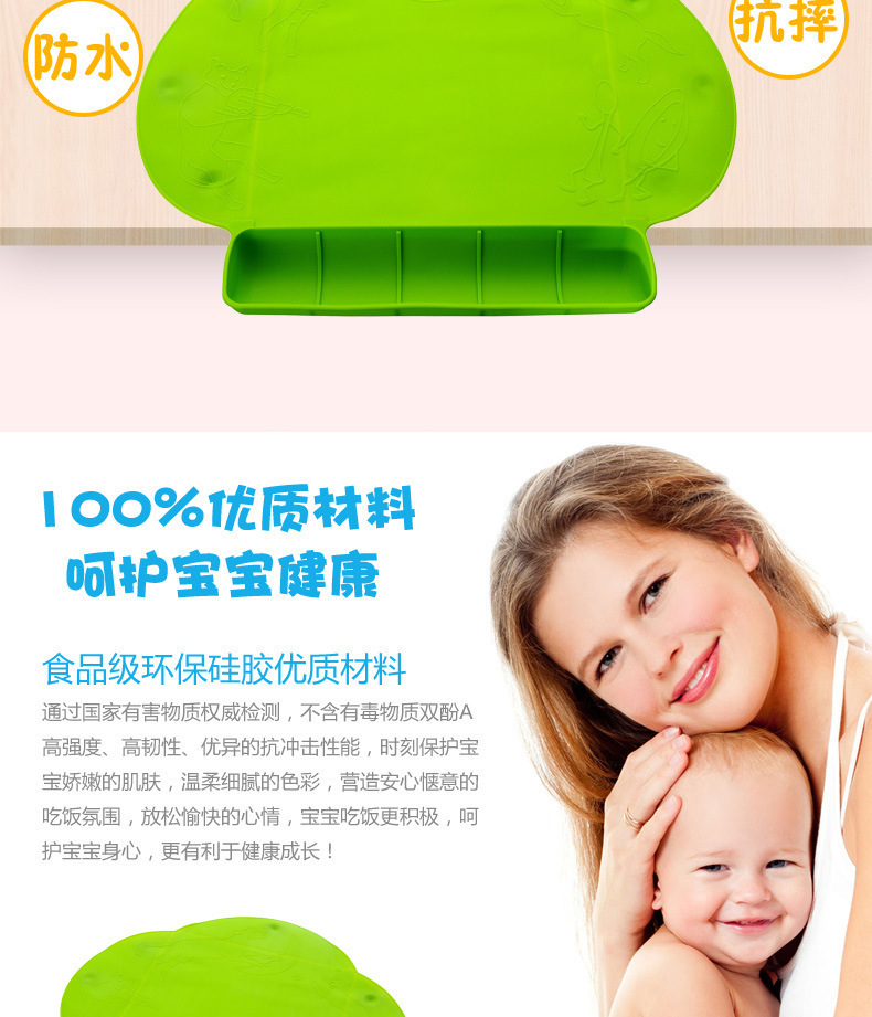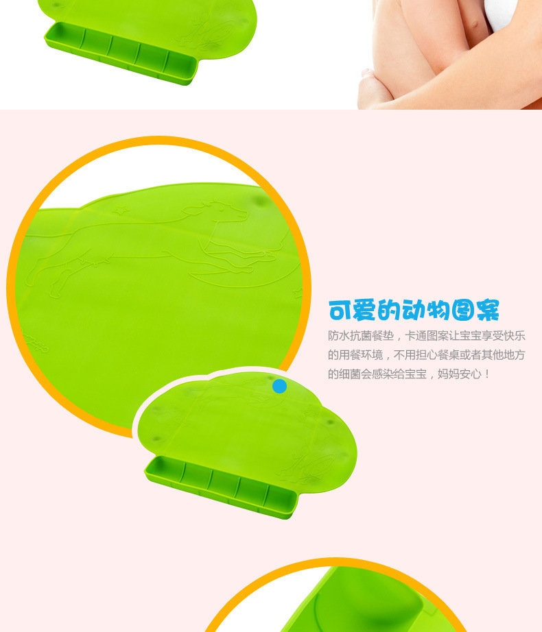 3、防水抗菌餐垫,卡通图案让宝宝享受快乐的用餐环境,不用担心餐桌或者其他地方的细菌会感染给宝宝,妈妈安心!