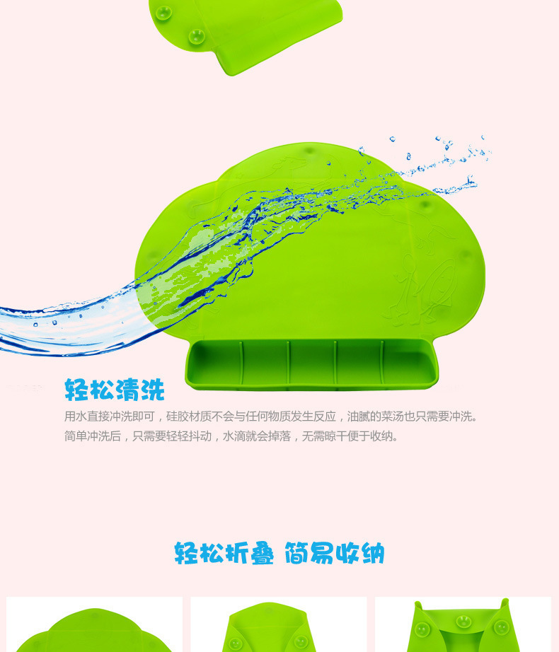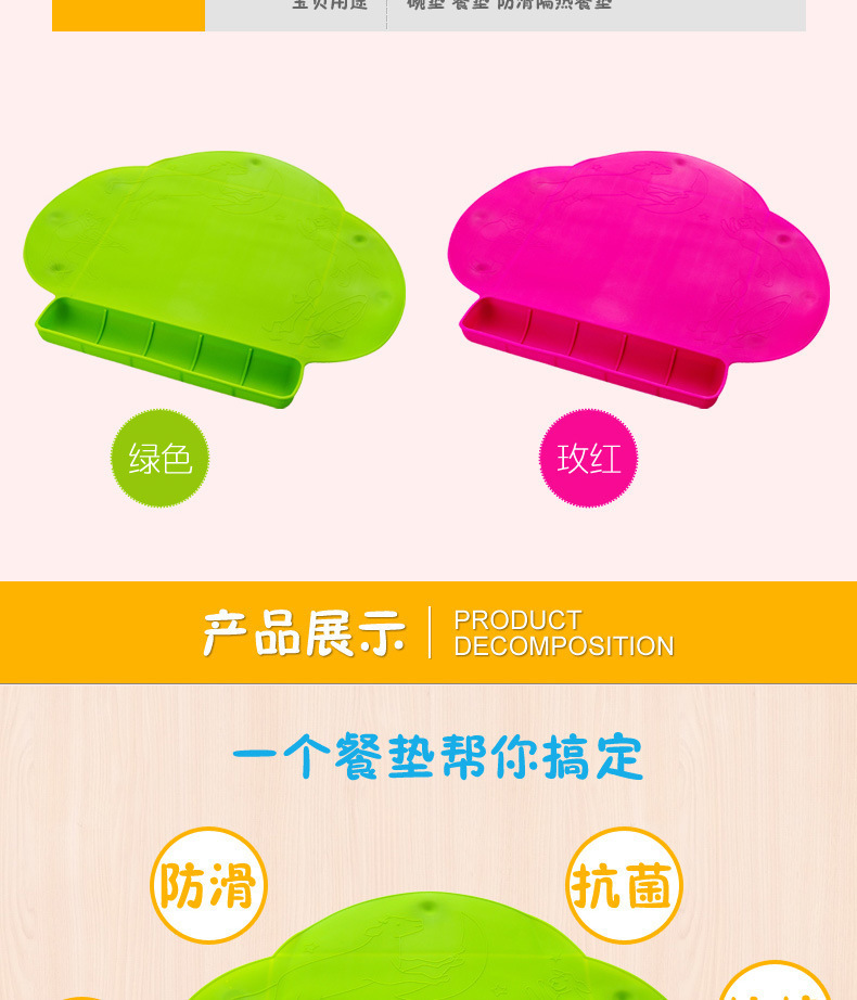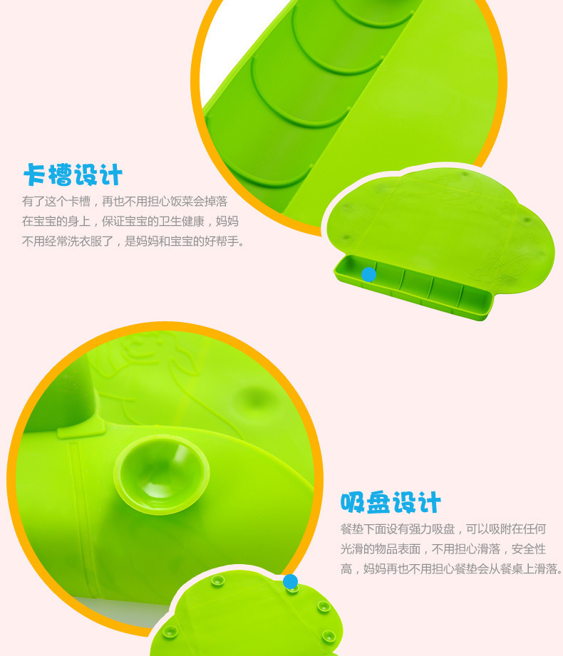 5、餐垫下面设有强力吸盘,可以吸附在任何光滑的物品表面,不用担心滑落,安全性高,妈妈再也不用担心餐垫会从餐桌滑落