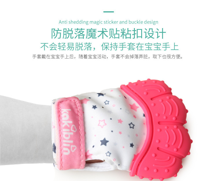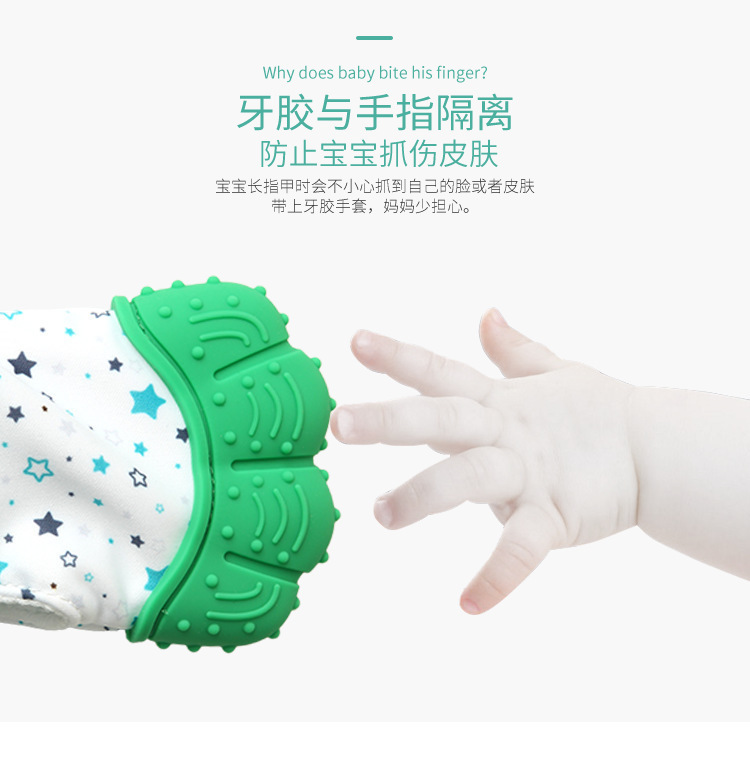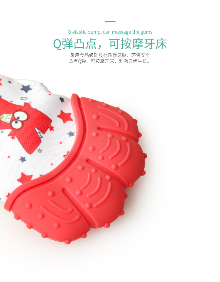 4、常规牙胶解决不了宝宝咬手指,磨牙手套能较好将手与牙齿隔开,宝宝啃咬时,既不会咬到手,还能按摩牙床。