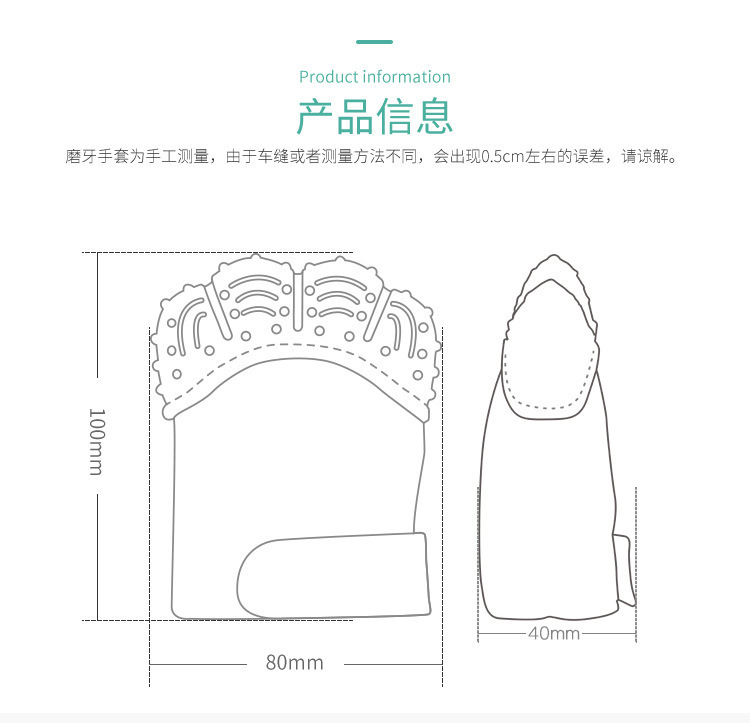 产品用途:牙胶手套可以更好的将手和牙齿隔开,宝宝啃咬时,既不会咬到手指,还可以按摩牙床。