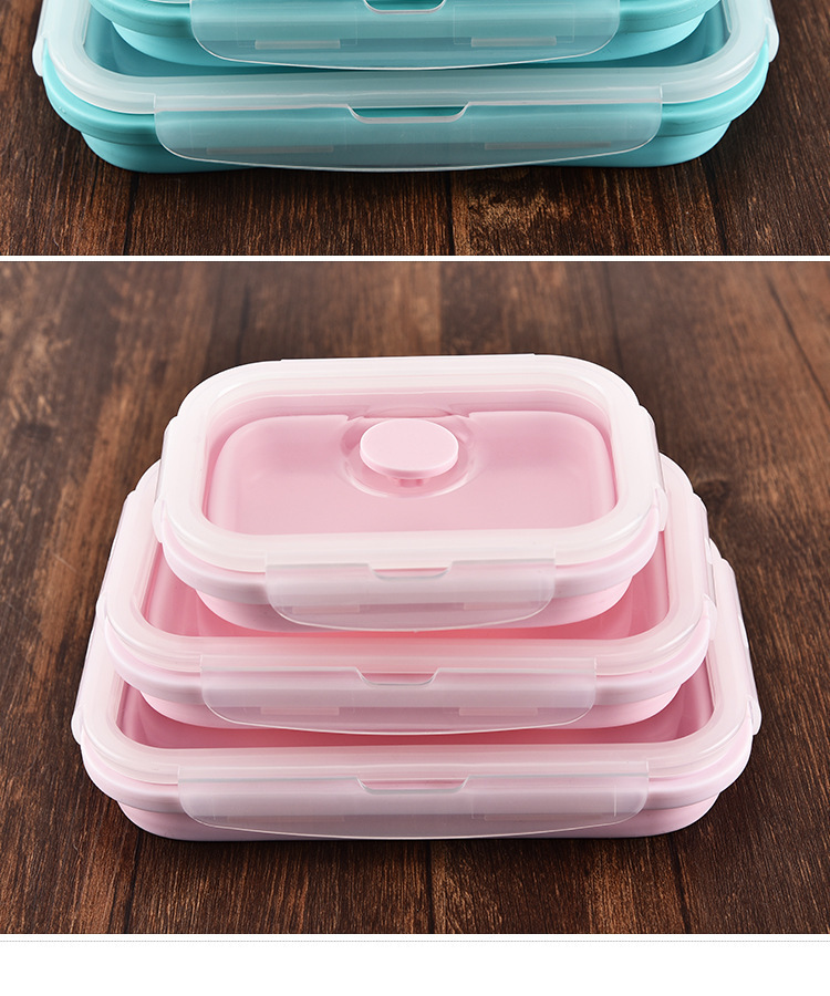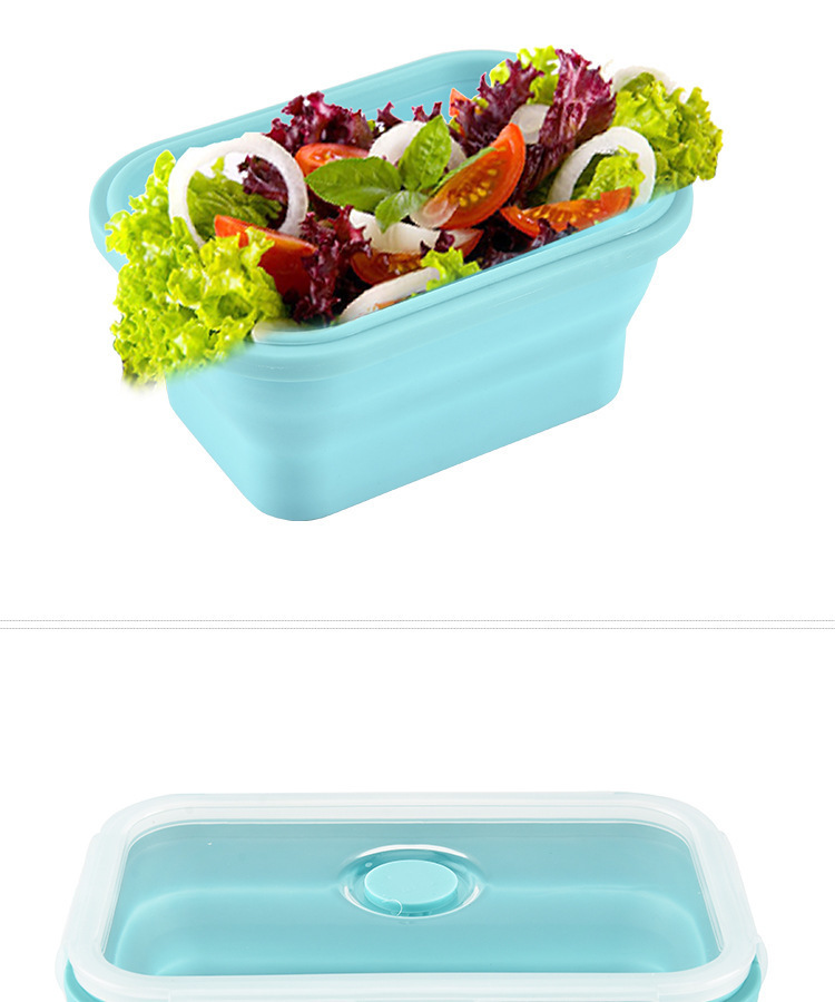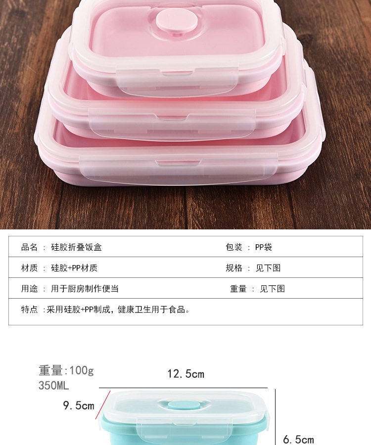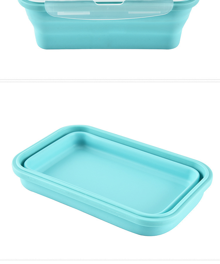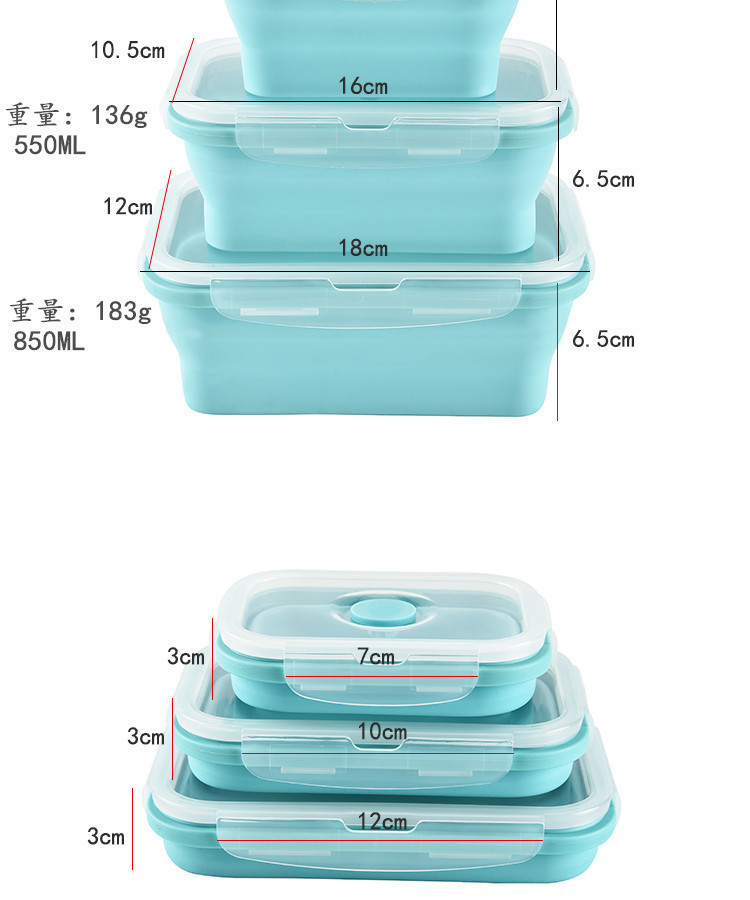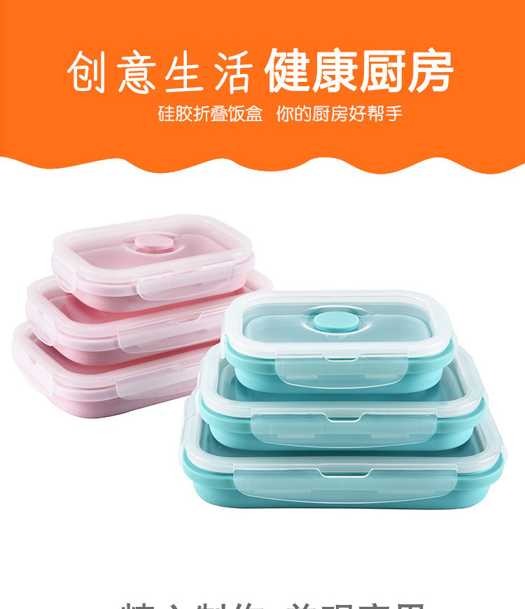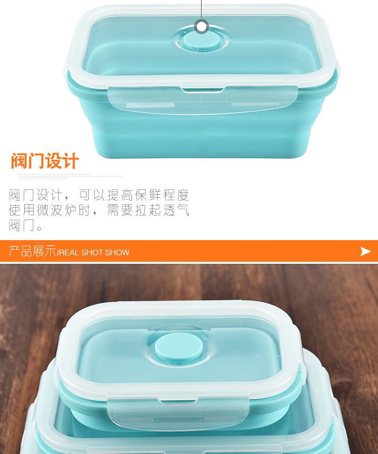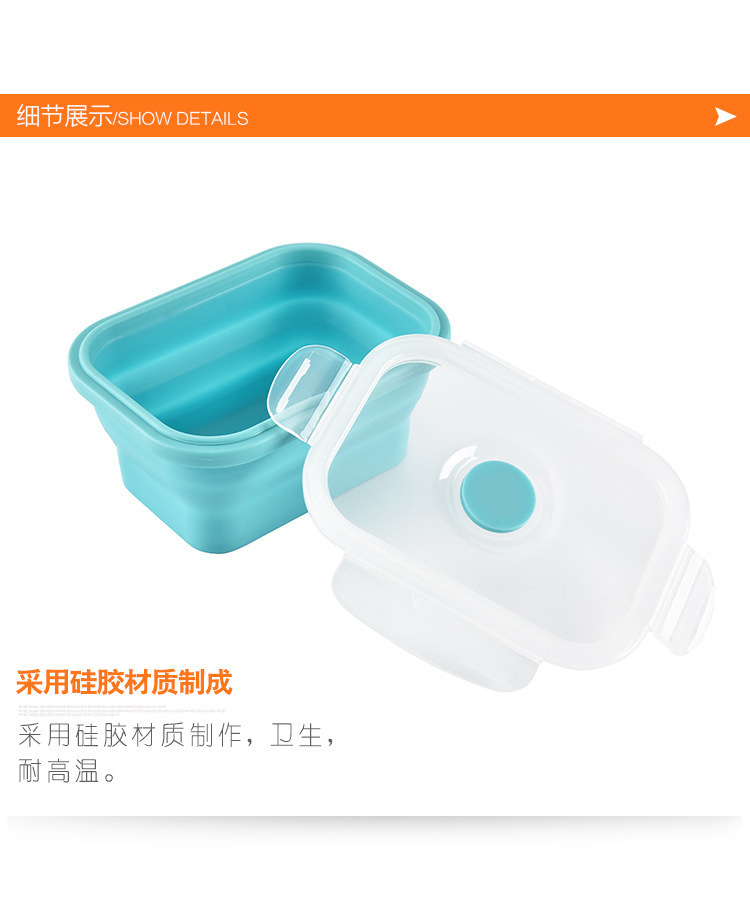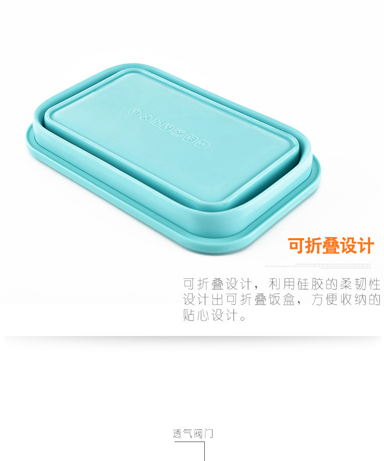 2、可折叠设计,利用硅胶的柔韧特性设计出可以折叠的饭盒,方便收纳的贴心设计