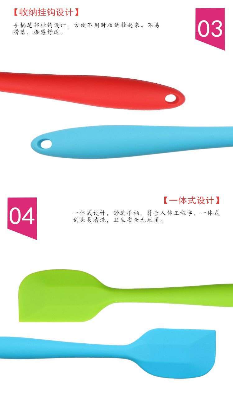 用途:做蛋糕,搅拌蛋白和蛋糕面糊均匀;可有效刮净搅拌盆表面的残留面糊、蛋白糊,集中食材并再次利用,减少损耗;抹平倒入模具中的面糊等等;清洗方便用于刮去不沾烤盘、不沾布、铝合金烤盘等上面的残渣、碎屑,不会刮伤产品表面。